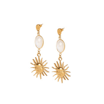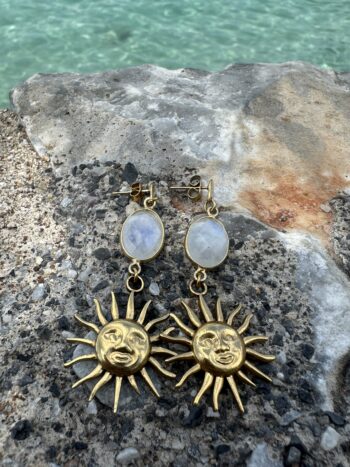 Our “Sole Moonstone Earrings” are composed of stainless steel hoops and gold plated silver 925, briole moonstone. A Mediterranean ode to the Greek islands, that gives you that chic island lifestyle!