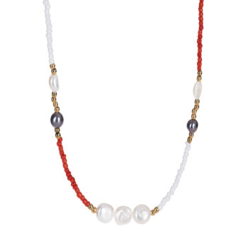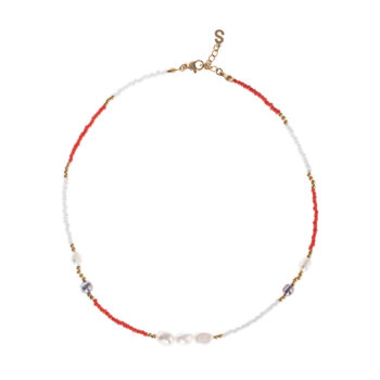 Our “Knossos Coral Necklace” radiates the ancient greek aesthetics: proportion, symmetry, and harmony. It’s a hand-strung necklace composed of natural freshwater pearls, glass beads and corals.