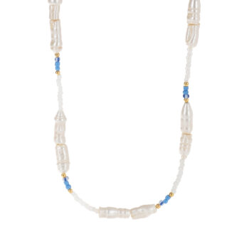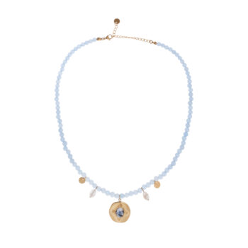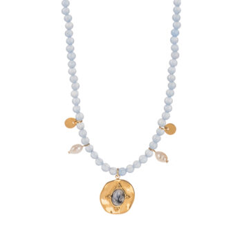 Our “Periapt Necklace” is a soft journey into Aegean light,f reshwater pearls, sky-blue Achate jemstones, and gold plated stainless steel details come together in a pendant inspired by ancient Greek talismans. A touch of everyday magic. Wear it solo or stack it with an another “Sunday exquisite” necklace!