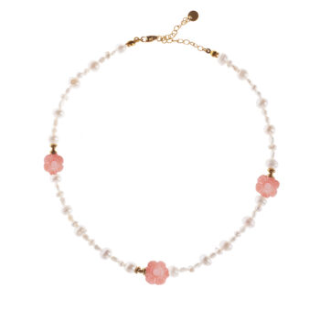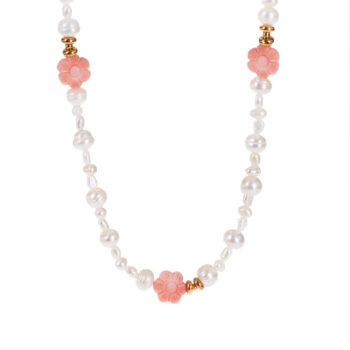 Our “Hawaii Coral Necklace” combines the classic elegance of freshwater pearls with the pink hues of the coral made flower beeds. All the rondelles and beads used are a high quality of stainless steel .Perfect for special occasions or everyday wear, this necklace effortlessly enhances any outfit!